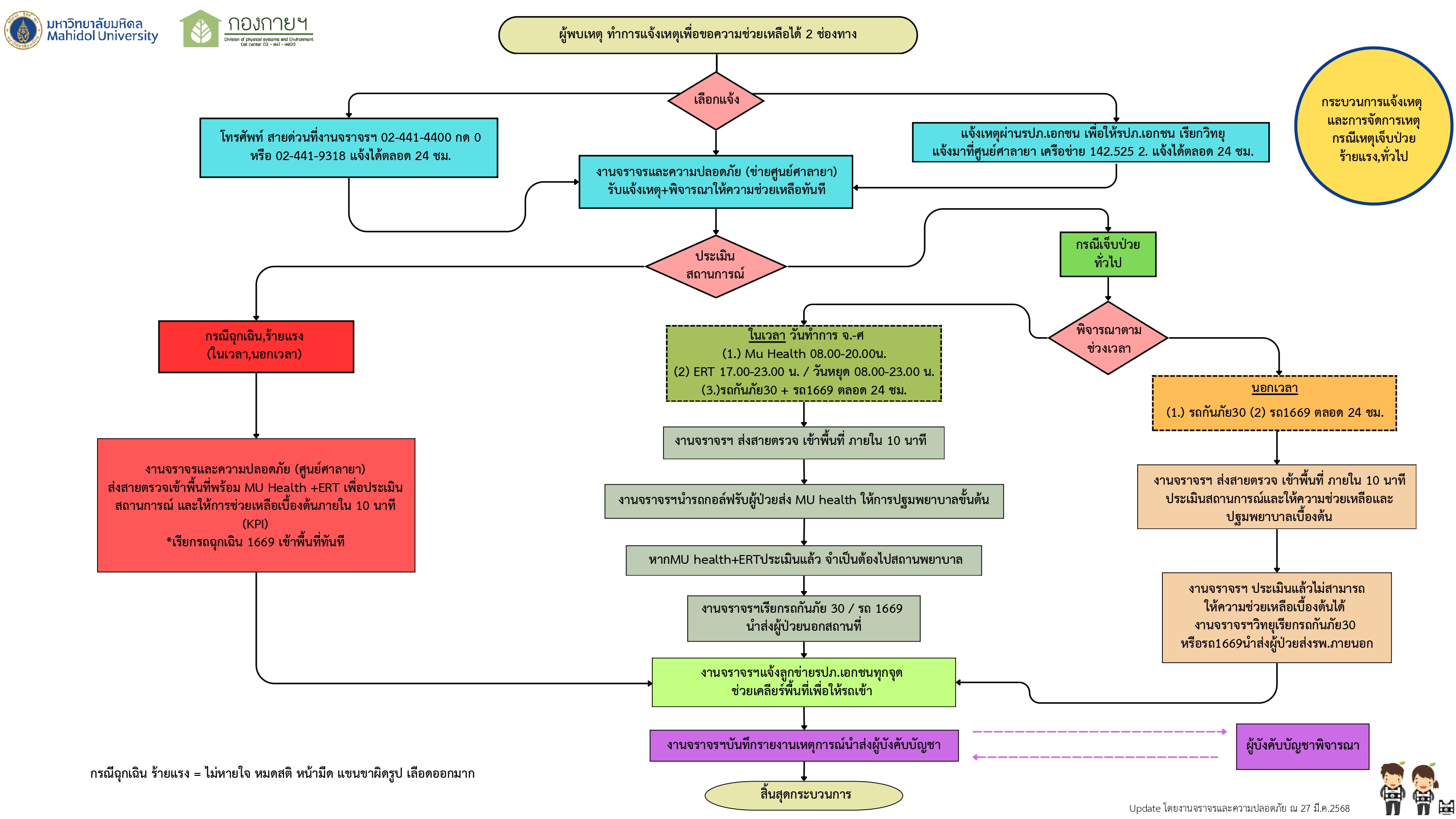 สามารถแจ้งเจ้าหน้าที่รักษาควาามปลอดภัยประจำจุด หรืองานจราจรและความปลอดภัย โทรศัพท์ 02-441-4400 ซึ่งจะมีขั้นตอนการประสานงานตามความรุนแรงของเหตุการณ์ คือ สถานการณ์เจ็บป่วยทั่วไป จะแจ้งประสานงานรถจัดส่งผู้ป่วยเพื่อนำส่งศูนย์การแพทย์กาญจนาภิเษก หรือโรงพยาบาลพุทธมณฑล สถานการณ์ร้ายแรง จะแจ้งประสานงานสถาบันการแพทย์ฉุกเฉินแห่งชาติ หมายเลข 1669 ซึ่งระหว่างนั้น ทางงานจราจรและความปลอดภัย กองกายภาพและสิ่งแวดล้อม จะอำนวยความสะดวกในการเข้าถึงพื้นที่ ประเมินอาการพร้อมปฐมพยาบาลเบื้องต้นควบคู่กับหน่วยบริการสุขภาพ กองกิจการนักศึกษา ซึ่งมีมาตรการปฏิบัติฉุกเฉินในเหตุบาดเจ็บบนถนน ดังนี้