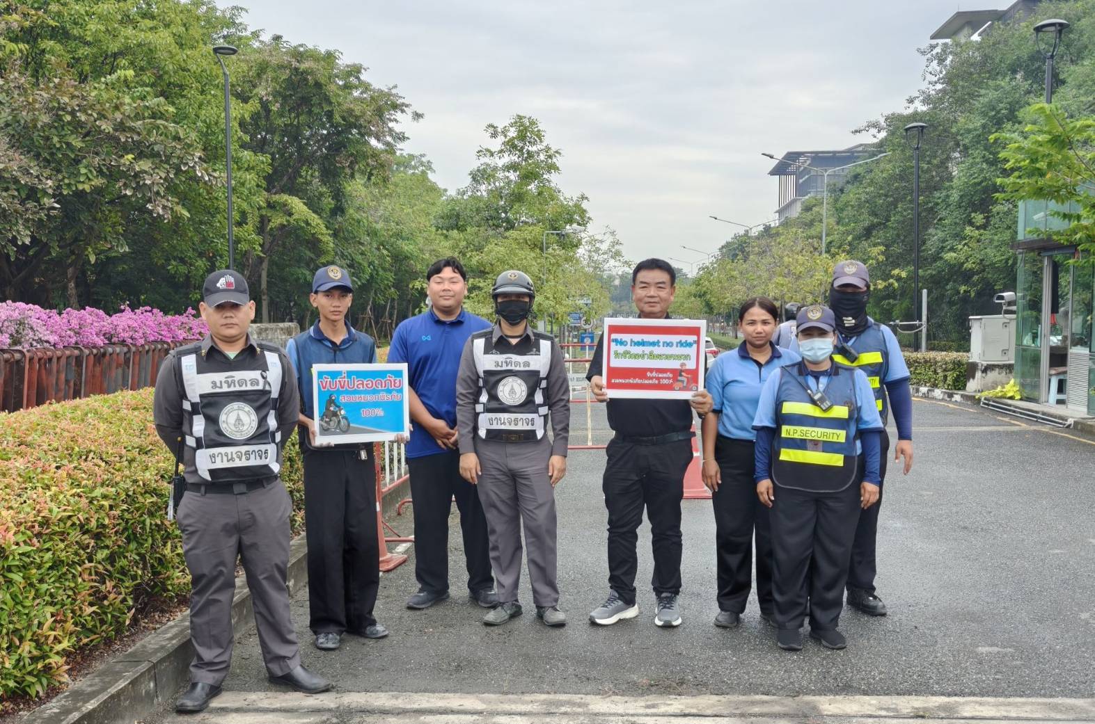 นอกจากนี้ ด้วยปริมาณรถจักรยานยนต์ที่สัญจรภายในมหาวิทยาลัยมีจำนวนมาก ซึ่งมีผู้ขับขี่ทั้งที่เป็นนักศึกษา บุคลากร บริษัทผู้รับจ้าง และจักรยานยนต์รับจ้างจากภายนอก จึงให้ความสำคัญกับการสวมหมวกนิรภัยเพื่อป้องกันการบาดเจ็บที่ศีรษะและใบหน้า ซึ่งช่วยลดอันตรายจากการเกิดอุบัติเหตุได้ จึงกำหนด ประกาศมหาวิทยาลัยมหิดล เรื่อง หลักเกณฑ์การสวมหมวกนิรภัยในการใช้รถจักรยานยนต์ มหาวิทยาลัยมหิดล ศาลายา พ.ศ. 2565 ที่กำหนดให้พื้นที่มหาวิทยาลัยมหิดล ศาลายา เป็นเขตสวมหมวกนิรภัยและกำหนดหลักเกณฑ์การปฏิบัติการสวมหมวกนิรภัย โดยมหาวิทยาลัยมหิดลดำเนินโครงการรณรงค์การสวมหมวกกนิรภัย 100 เปอร์เซ็นต์ ตั้งแต่เดือน สิงหาคม 2556 ตามมติคณะรัฐมนตรีที่สนับสนุนแนวทางการดำเนินการตามแผนปฏิบัติการ “ทศวรรษแห่งความปลอดภัยทางถนน พ.ศ. 2554-2563 และลดอุบัติเหตุและความสูญเสียด้านทรัพย์สินและชีวิตที่เกิดจากรถจักรยานยนต์ ซึ่งการสวมหมวกนิรภัยสามารถป้องกันการบาดเจ็บที่ศีรษะและใบหน้า ช่วยลดอันตรายจากการเกิดอุบัติเหตุ และหมวกกนิรภัยที่ได้มาตรฐานจะช่วยเพิ่มความปลอดภัยระหว่างขับขี่จากการเพิ่มทัศนวิสัยที่ดีขึ้นและป้องกันจากสภาพอากาศได้