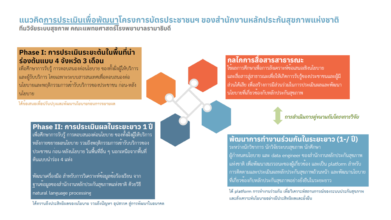 ประเทศไทยมีการจัดตั้งกองทุนหลักประกันสุขภาพถ้วนหน้า เพื่อดูแลประชาชนที่ไม่ใช่กลุ่มข้าราชการและลูกจ้างในระบบการจ้างงาน ในรูปแบบหลักประกันสุขภาพถ้วนหน้า (หรือบัตร 30 บาทรักษาทุกโรค) ที่ครอบคลุมประชากรสัญชาติไทยทุกคน ทั้งด้านประชากร (population coverage) ด้านการได้รับบริการสุขภาพที่จำเป็น (service coverage) และการคุ้มครองค่าใช้จ่ายของการเข้ารับการบริการด้านสุขภาพรูปแบบต่าง ๆ (financial risk protection) โดยในปี 2565 รัฐบาลได้ออกนโยบายบัตรประชาชนใบเดียวรักษาได้ทุกที่ (One ID policy) เพื่อยกระดับบัตร 30 บาทรักษาทุกโรค โดยมีหลักการดำเนินนโยบายที่เน้นเพิ่มการเข้าถึงบริการ การพัฒนาระบบการบริหารการเบิกจ่าย การติดตามประเมินผลให้มีประสิทธิภาพ และเชื่อมโยงข้อมูลสุขภาพในทุกหน่วยบริการ เพื่อเพิ่มความสะดวกให้ประชาชนสามารถเข้าถึงบริการสุขภาพที่จำเป็นได้อย่างทั่วถึง ผ่านการทำงานร่วมกันระหว่างกระทรวงสาธารณสุข และสำนักงานหลักประกันสุขภาพแห่งชาติ โดยกระทรวงสาธารณสุขทำหน้าที่ขับเคลื่อนการพัฒนาระบบเชื่อมโยงและบูรณาการระบบสารสนเทศด้านสุขภาพต่าง ๆ ส่วนสำนักงานหลักประกันสุขภาพแห่งชาติทำหน้าที่พัฒนาระบบการบริหารการเบิกจ่าย และการติดตามประเมินผลให้มีประสิทธิภาพ โดยเริ่มทดลองใช้นโยบายบัตรประชาชนใบเดียวรักษาได้ทุกที่ในพื้นที่นำร่อง 4 จังหวัด ได้แก่ นราธิวาส เพชรบุรี แพร่ และร้อยเอ็ด ก่อนจะขยายไปในพื้นที่อื่น ซึ่งปัจจุบันมีจังหวัดที่ดำเนินการนโยบายบัตรประชาชนใบเดียวรักษาได้ทุกที่กว่า 45 จังหวัด จึงเกิดโครงการกำกับ ติดตาม และประเมินนโยบายบัตรประชาชนใบเดียวรักษาได้ทุกที่ เพื่อสำรวจการตอบสนอง ความท้าทาย และข้อเสนอของหน่วยบริการสุขภาพต่อนโยบายบัตรประชาชนใบเดียวรักษาได้ทุกที่ สำหรับเสนอผู้กำหนดนโยบายบัตรประชาชนใบเดียวรักษาได้ทุกที่ (สำนักงานหลักประกันสุขภาพแห่งชาติ และกระทรวงสาธารณสุข) ตลอดจนศึกษาการเปลี่ยนแปลงของพฤติกรรมการเข้ารับบริการสุขภาพของประชาชน และพัฒนารูปแบบการทำงานร่วมกัน ระหว่างนักวิชาการในฐานะนักวิจัยนโยบายและระบบสุขภาพกับผู้กำหนดนโยบาย เพื่อให้การดำเนินนโยบายบัตรประชาชนใบเดียวรักษาได้ทุกที่เป็นไปอย่างราบรื่นในอนาคต โดยมีระเบียบวิธีการประเมิน ดังนี้