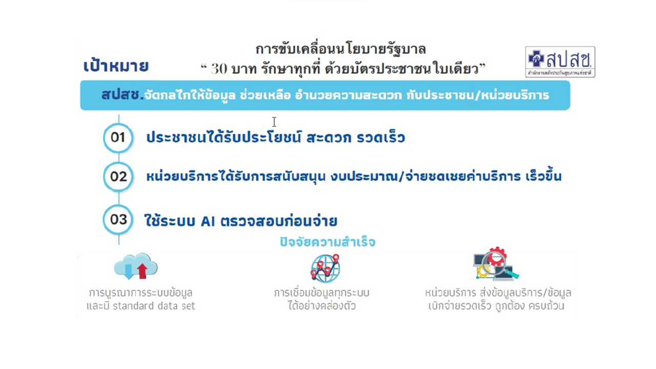 นโยบายบัตรประชาชนใบเดียวรักษาได้ทุกที่ เพิ่มการเข้าถึงบริการสาธารณสุขให้ครอบคลุม พัฒนาการให้บริการดูแลสุขภาพของประชาชน เชื่อมโยงข้อมูลสุขภาพในทุกหน่วยบริการ และวางแผนกำกับระบบสุขภาพของประเทศ