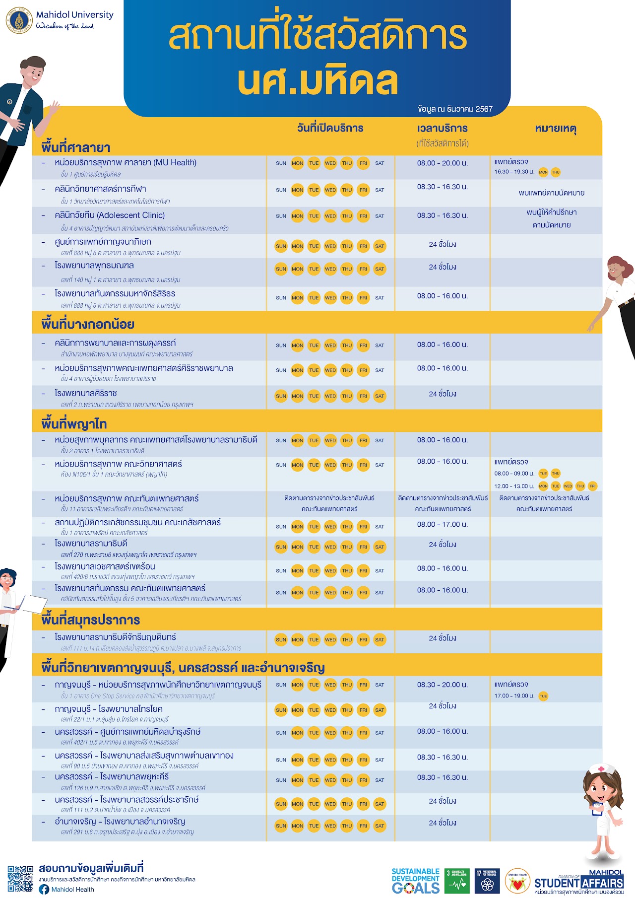Mahidol University operates a mental health counseling center that provides support for both students and the general public, as well as a teen clinic offering counseling on various adolescent issues, such as drug addiction and sexual concerns. In addition, the university offers comprehensive sexual and reproductive health care services, including sex education, relationship counseling, contraception, STI testing and treatment, and support for unintended pregnancies. These services are delivered through the university’s medical center, which houses permanent clinics in various specialties such as internal medicine, dentistry, and cardiology. Through these initiatives, Mahidol University aims to promote the physical, emotional, and social well-being of its students and young people, ensuring access to holistic health care and informed decision-making.