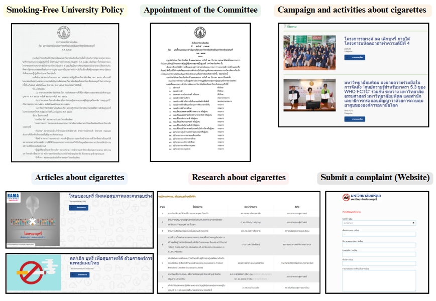 Mahidol University has continuously developed various initiatives related to the health protection of non-smoker students and staff. Mahidol University has been operating in the following areas: