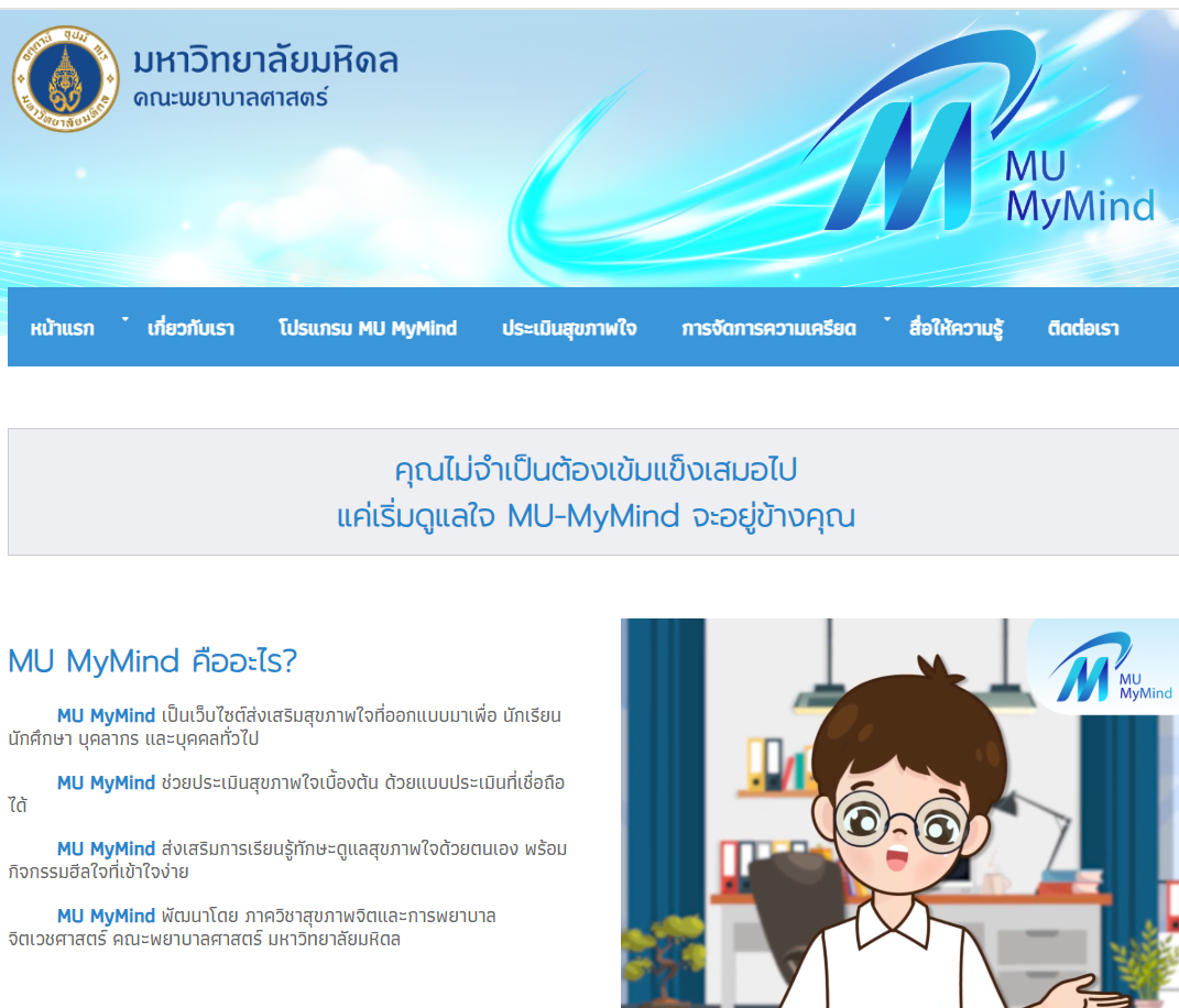 The second initiative, MU MyMind , is a mental health promotion website designed for students, staff, and the general public. It provides reliable basic mental health assessments, promotes self-care practices, and offers easy-to-access healing activities. It invites everyone to take care of their mental health through a simple 5-step program that helps build calmness, stability, and self-awareness. Developed by a research team from the Department of Mental Health and Psychiatric Nursing, Faculty of Nursing, Mahidol University, the program is grounded in real-world research and takes about 12 days to complete. Participants who finish all five steps often experience greater mindfulness and better stress management. Supported by the National Research Council of Thailand (NRCT) from 2019–2020, research confirmed that the program effectively reduces stress, anxiety, and depression, with lasting improvements observed even after 3 and 6 months.