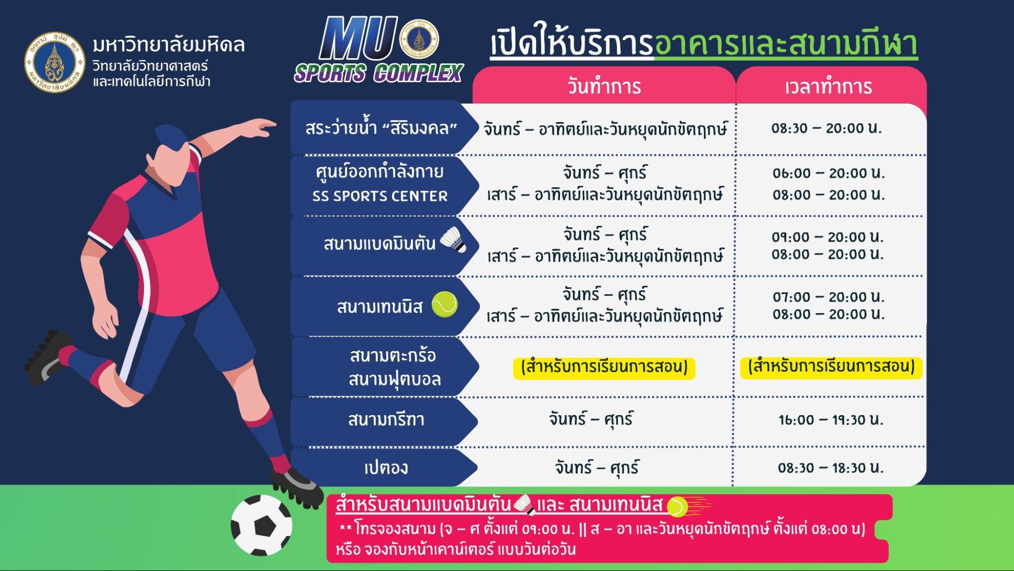 Mahidol University provides fitness centers and a variety of sports fields for students, staff, and the community to promote health and well-being. The Mahidol University (MU) Sports Complex, located at the College of Sports Science and Technology in Salaya, serves as a major hub for sports and recreational activities. This large facility offers both indoor and outdoor spaces for 11 types of sports, including football, athletics, basketball, futsal, volleyball, swimming, petanque, sepaktakraw, badminton, and tennis. It also features a swimming pool, fitness room, and multiple courts and fields that can be reserved online or in person. Managed by the College of Sports Science and Technology, the complex supports health-promoting activities, sports education, and competitions, fostering a culture of active living and sportsmanship among students, staff, and local residents while ensuring convenient access for all members of the community.