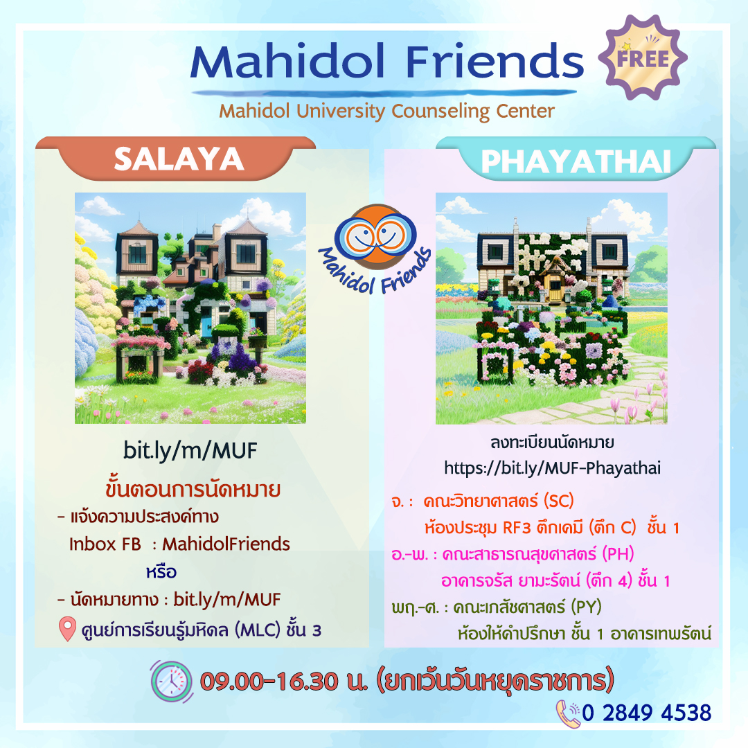 - Mahidol students and staff can receive counseling service at Salaya / Phayathai every day.