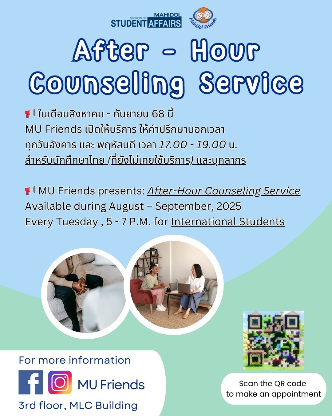 Mahidol University places great importance on the mental health of both students and staff. Therefore, Mahidol University provides mental health counseling services both during work hours and after work hours. Details of Mahidol Friends (MU Friends) : Counseling service are as follows: