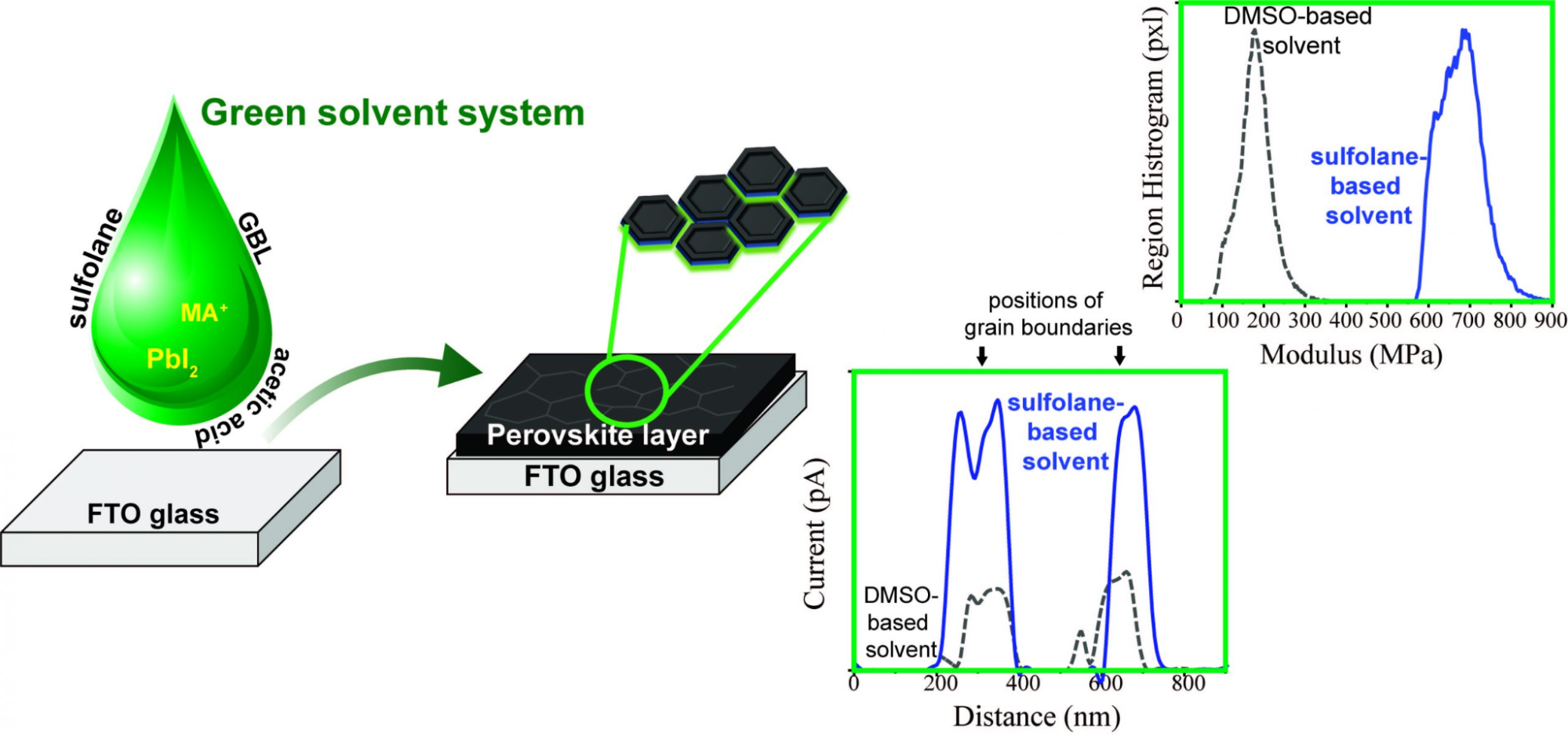 Testing of perovskite solar cells prepared with this solvent system revealed several positive effects beyond its environmental benefits. The perovskite crystals became larger and of higher quality, with stronger grain boundaries that improved electrical conductivity. Sulfolane molecules were found to occupy the grain boundary regions, reinforcing them and acting as a moisture barrier—further enhancing the overall performance and stability of the solar cell devices.