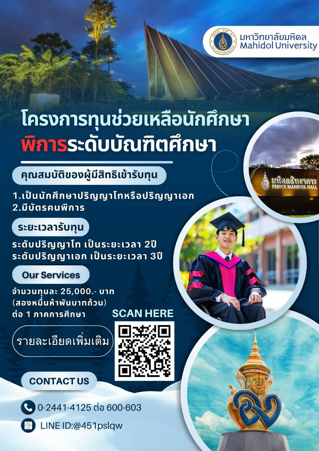 Furthermore, Mahidol University also provides graduate-level scholarships for students with disabilities pursuing master’s or doctoral degrees to promote educational opportunities and professional development.
