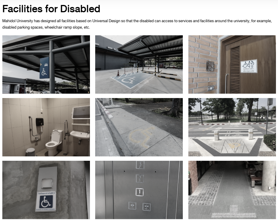 Mahidol University ensures that its campus environment and facilities are designed according to Universal Design principles, enabling individuals with disabilities to access and utilize all areas with ease and equality. The university has implemented a wide range of accessible features, such as designated parking spaces for people with disabilities, wheelchair ramps, and barrier-free pathways, ensuring convenience, safety, and inclusivity throughout the campus.