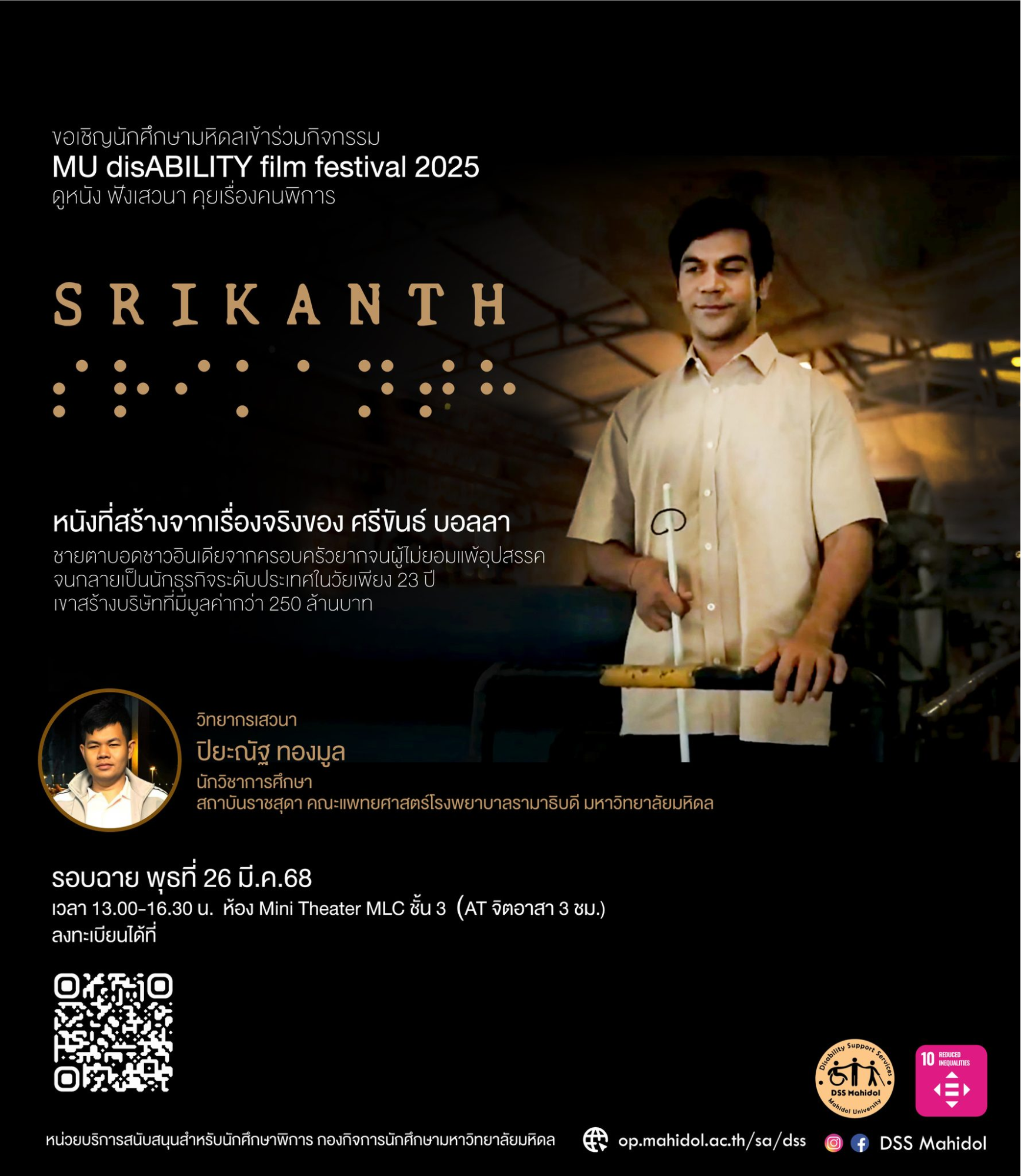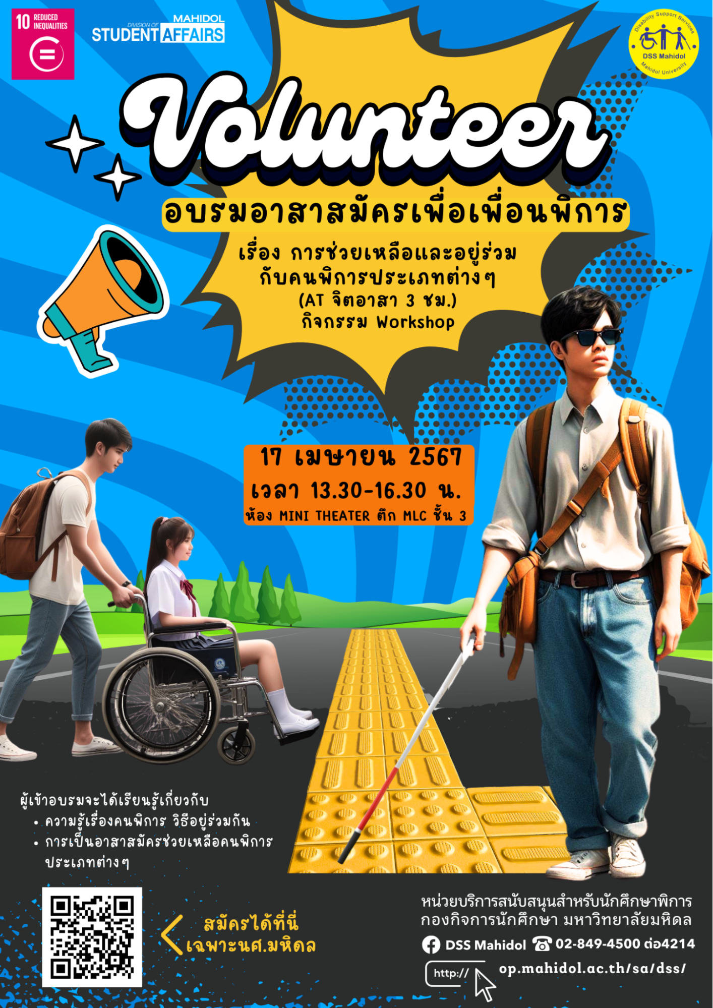 Mahidol University is committed to being an Inclusive University—a place where all individuals, regardless of ability, race, or religion, have equal opportunities to learn, grow, and contribute to society. The Disability Support Services (DSS) unit under the Division of Student Affairs provides comprehensive assistance to ensure that students with disabilities can access education and university life on an equal basis with others.