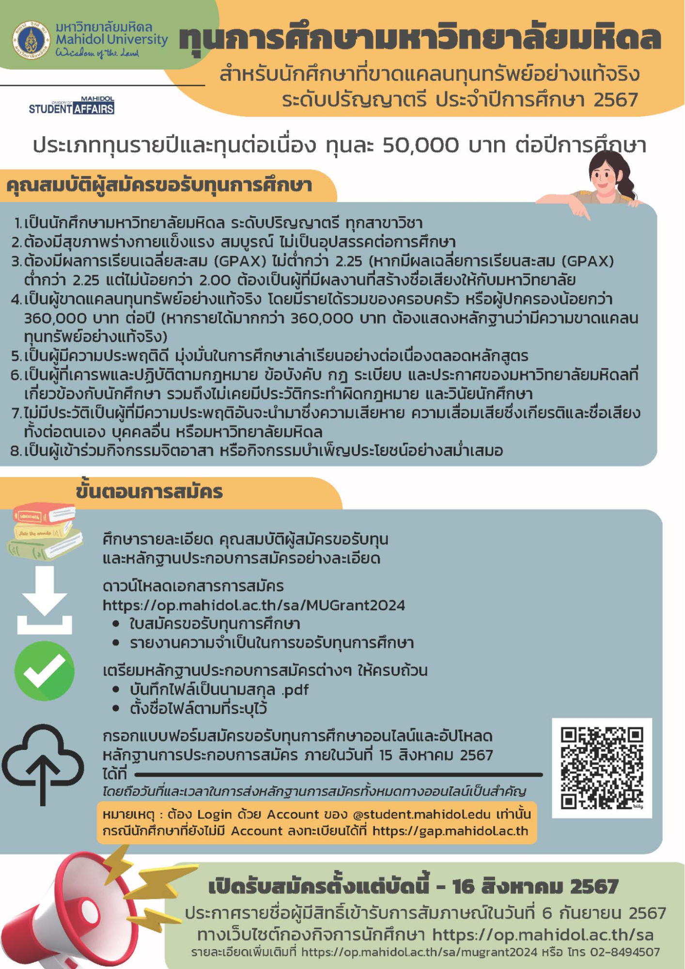 Mahidol University admits students to its associate, undergraduate, and graduate programs based on the principles of fairness, honesty, transparency, accountability, and equality, in accordance with the University’s good governance standards.