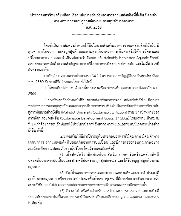 In recognition of the importance of establishing a policy to promote food sourced from sustainable production systems that are nutritious and hygienic in accordance with food sanitation standards, Mahidol University encourages the responsible sourcing and consumption of aquatic food (Sustainably Harvested Aquatic Food).