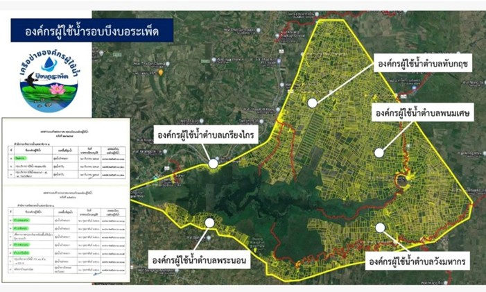 During the 2023–2024 implementation phase, the project expanded participation through training, youth engagement, and the creation of the Bueng Boraphet Data Center and learning materials. As a result, nine subdistricts and over 3,700 individuals registered their water use needs, covering 5,011 plots (69,871 rai), while conflict levels among users dropped to zero. The project also launched a Water Image Downloader system to utilize satellite imagery for monitoring and planning, and more than 200 people have visited the learning center. Recognized and certified by the Nakhon Sawan Bueng Boraphet Management Committee. The system has become a model for participatory governance.