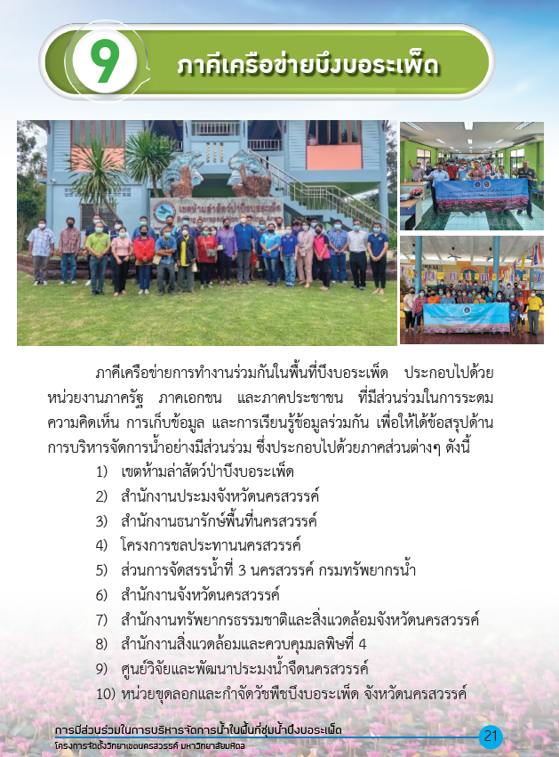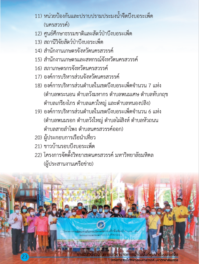 Between 2022 and 2024, Mahidol University expanded its collaboration by integrating sustainable aquaculture, eco-tourism, and agricultural water management. Local fishery cooperatives partnered with the university to receive training in eco-friendly fish farming, aquatic weed management, and sustainable harvesting techniques, balancing productivity with wetland conservation. The university also worked with community tourism groups to develop guided wetland learning tours and birdwatching programs, generating income while promoting environmental stewardship. Initiatives such as alternate wet–dry rice farming and organic fertilizer production from aquatic weeds helped restore natural nutrient cycles, reduce pollution, and enhance ecosystem resilience. Furthermore, two Low Carbon Community Enterprise Groups were co-established with local communities , connecting sustainable agriculture with responsible fisheries and tourism. A prototype community learning center within the Bueng Boraphet Wildlife Sanctuary , developed through multi-stakeholder collaboration, now serves as a regional hub for education, training, and knowledge exchange in integrated wetland management.