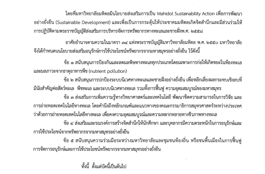 Mahidol University maintains a policy dedicated to preventing and reducing all forms of marine pollution, with a particular focus on pollution originating from land-based activities.