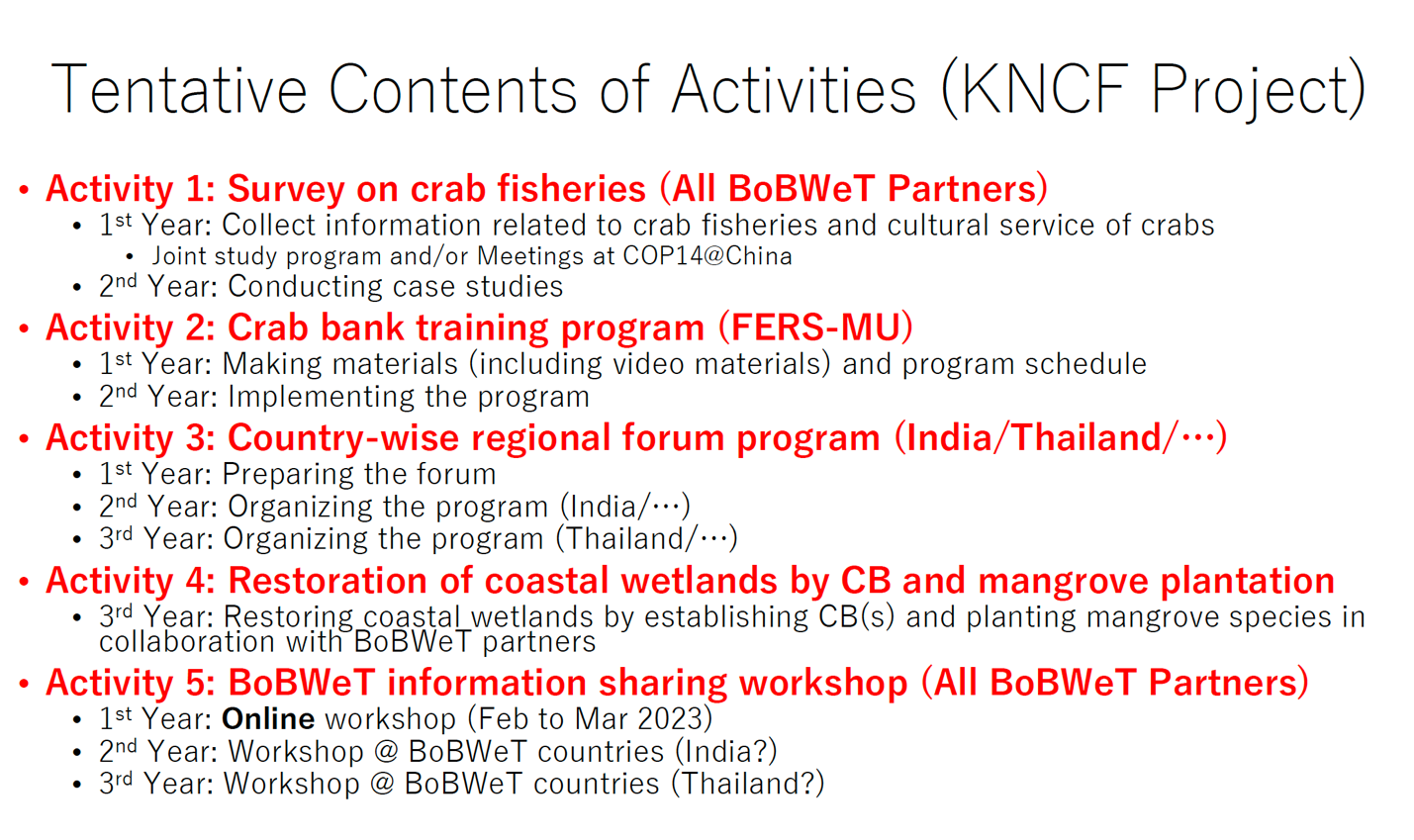 From 2022 to 2025, WMRTC has been implementing the “Establishing a Collaborative Network for Mangrove Conservation and a Model Area for Blue Swimming Crab and Mud Crab Conservation in the Bay of Bengal” project , supported by the Keidanren Nature Conservation Fund (KNCF). This initiative brings together eight coastal nations—Thailand, Sri Lanka, India, Bangladesh, Myanmar, Malaysia, Singapore, and Indonesia—through the Bay of Bengal Wetland Partnership (BoBWeT) to address regional challenges such as overfishing, mangrove loss, pollution, and climate change.