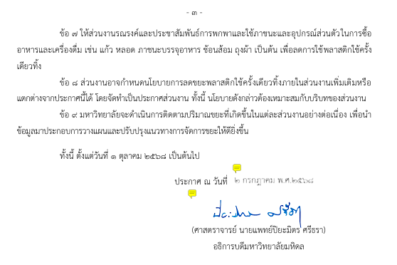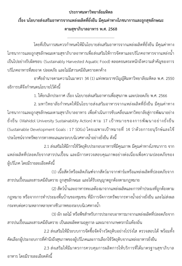 According to the “Mahidol University Announcement on the Policy to Promote Food from Sustainable Sources, Nutritious, and Hygienic according to Food Sanitation B.E. 2568 (2025)”