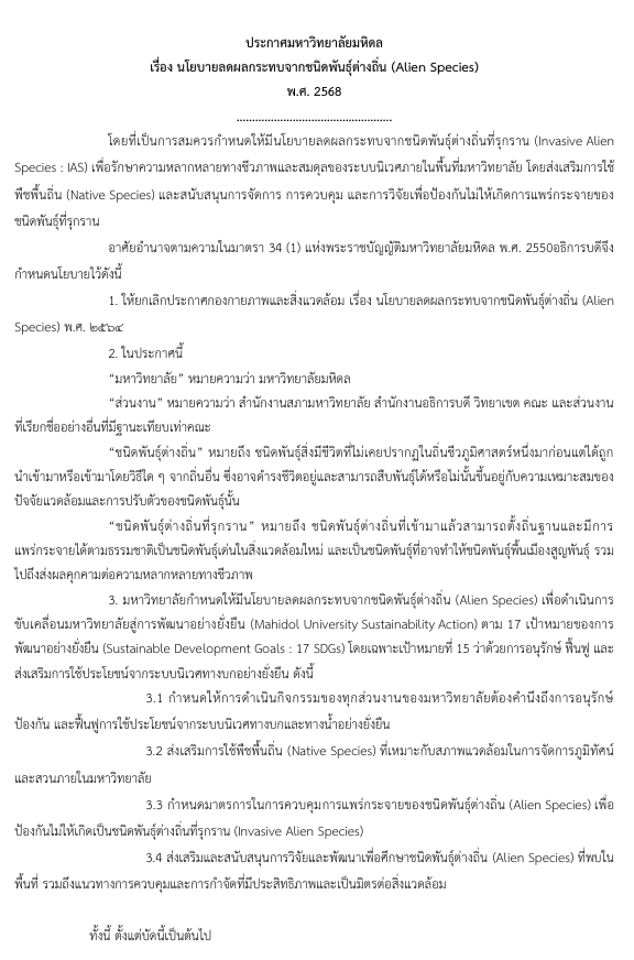Accordingly, the University has announced the “Policy on the Reduction of Impacts from Alien Species B.E. 2568 (2025)”, which serves as a core policy to control and mitigate the impacts of Invasive Alien Species (IAS) within university areas, addressing threats to biodiversity.