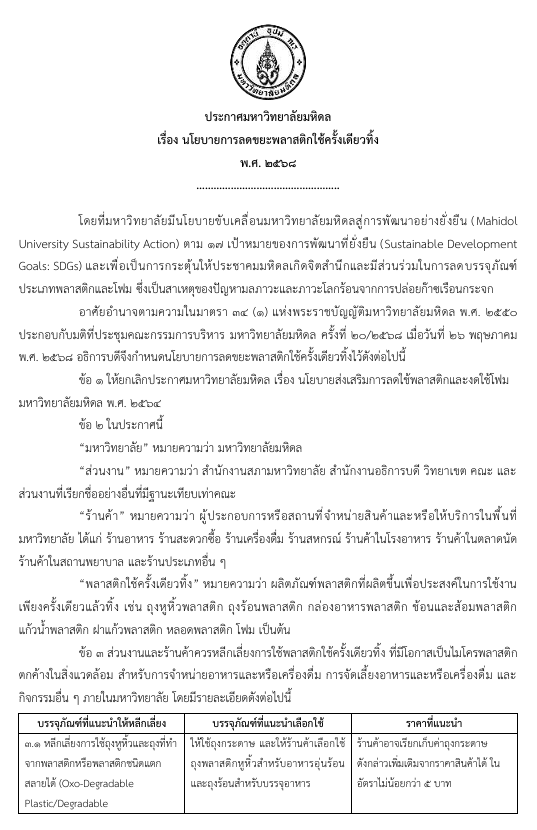 Mahidol University has implemented the Mahidol University Sustainability Action in alignment with the 17 Sustainable Development Goals (SDGs). To raise awareness and encourage participation among the Mahidol community in reducing the use of plastic and foam packaging—which are major contributors to pollution and global warming through greenhouse gas emissions—the university has established the following Single-Use Plastic Waste Reduction Policy.