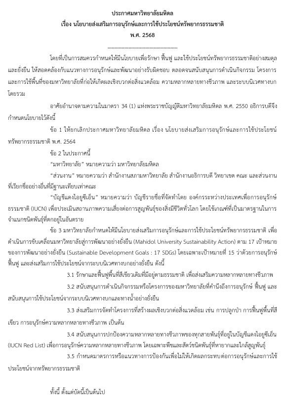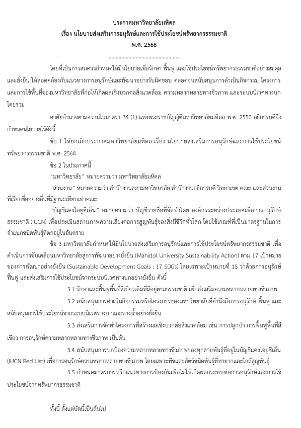 Mahidol University establishes this Policy on the Promotion of Conservation and Sustainable Use of Natural