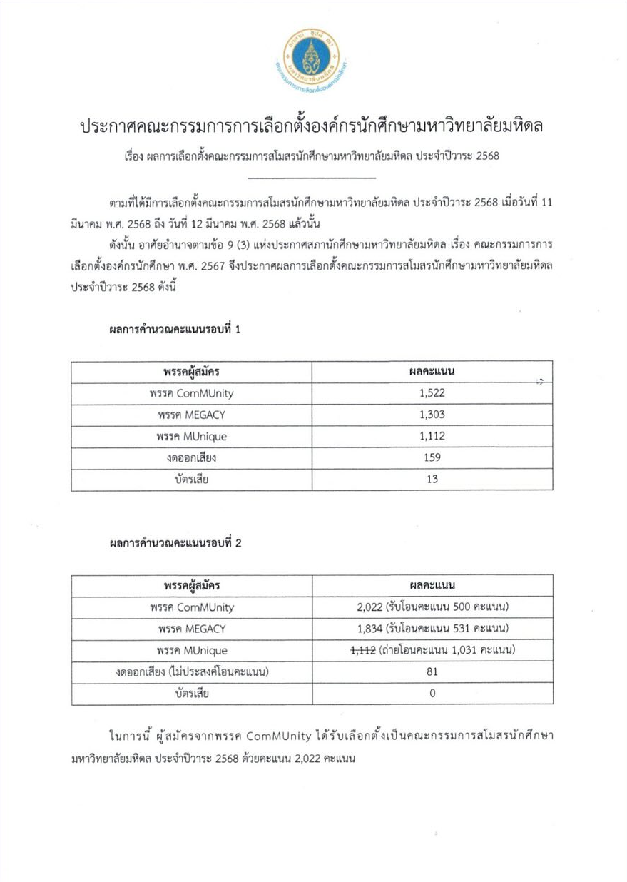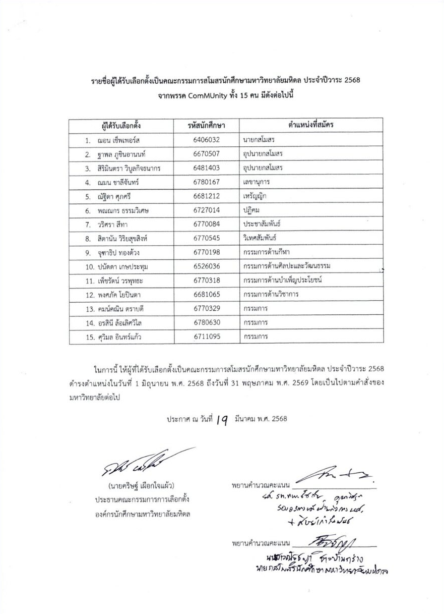 Mahidol University has officially announced the results of the Student Union Committee Election for the 2025 term. Elected Party: ComMUnity Party