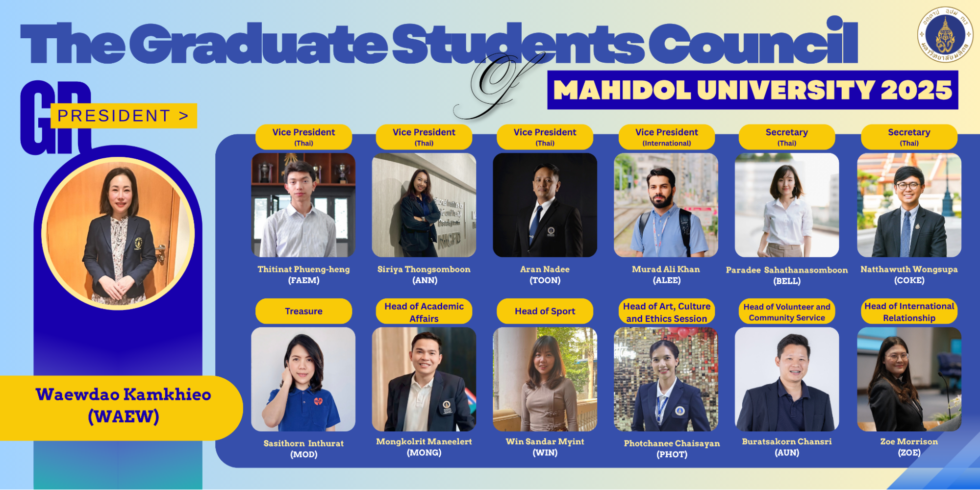 It organizes academic seminars, cultural exchanges, and community engagement activities to strengthen connections among graduate students and enhance their university experience. The Graduate Student Union also serves as a bridge between students and the university administration, ensuring that student voices contribute to Mahidol University’s continuous growth and commitment to academic excellence.