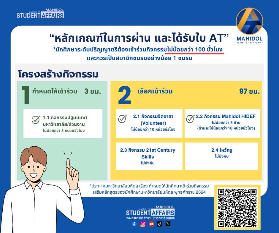 Co-curricular activities play a vital role in developing students into well-rounded graduates who are valuable to society and the nation, in line with Mahidol University’s philosophy and mission. Therefore, Mahidol University requires all undergraduate students who enrolled from the academic year 2009 onwards to participate in at least 15 co-curricular activities with a total of no less than 100 activity hours throughout their study period.