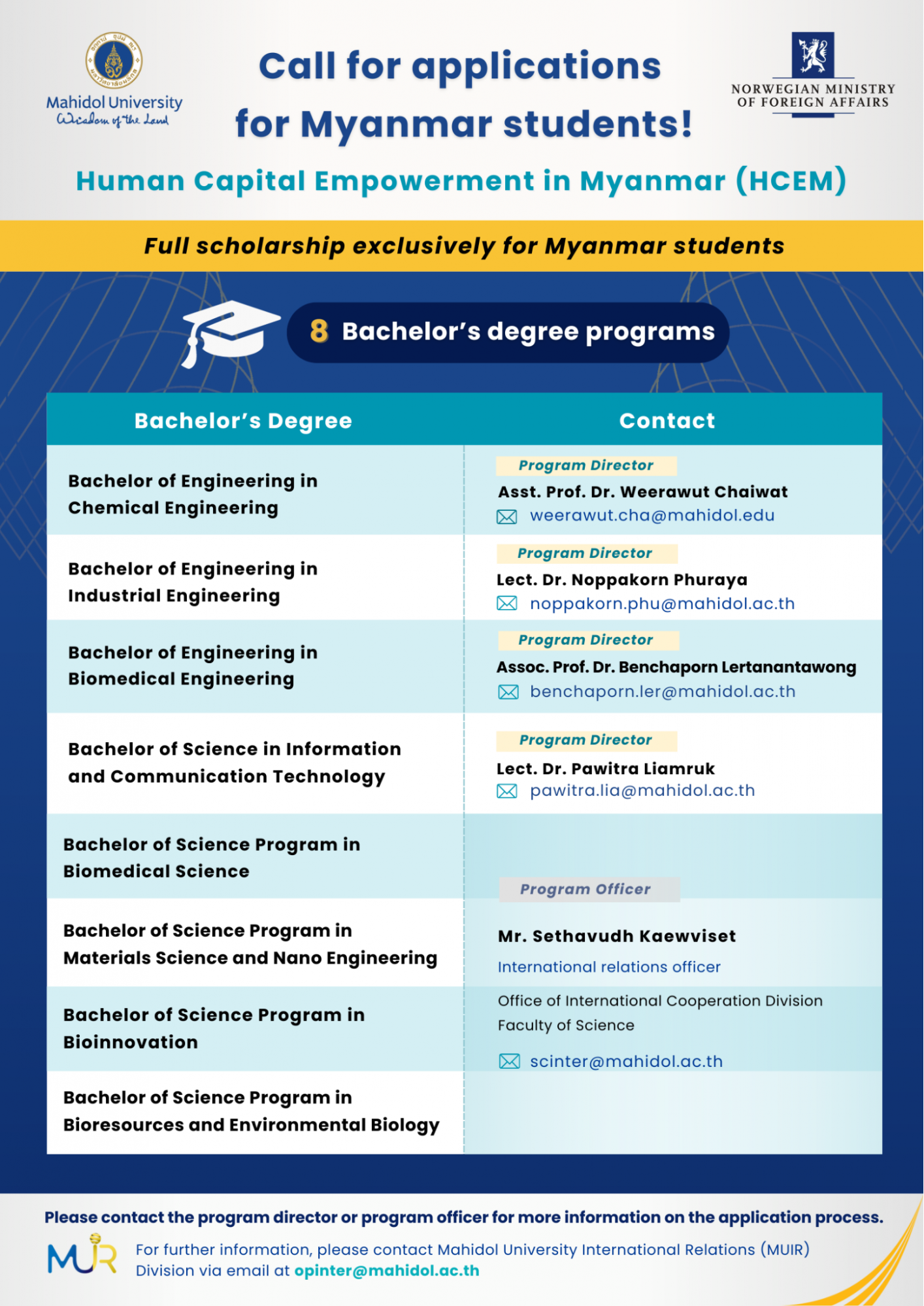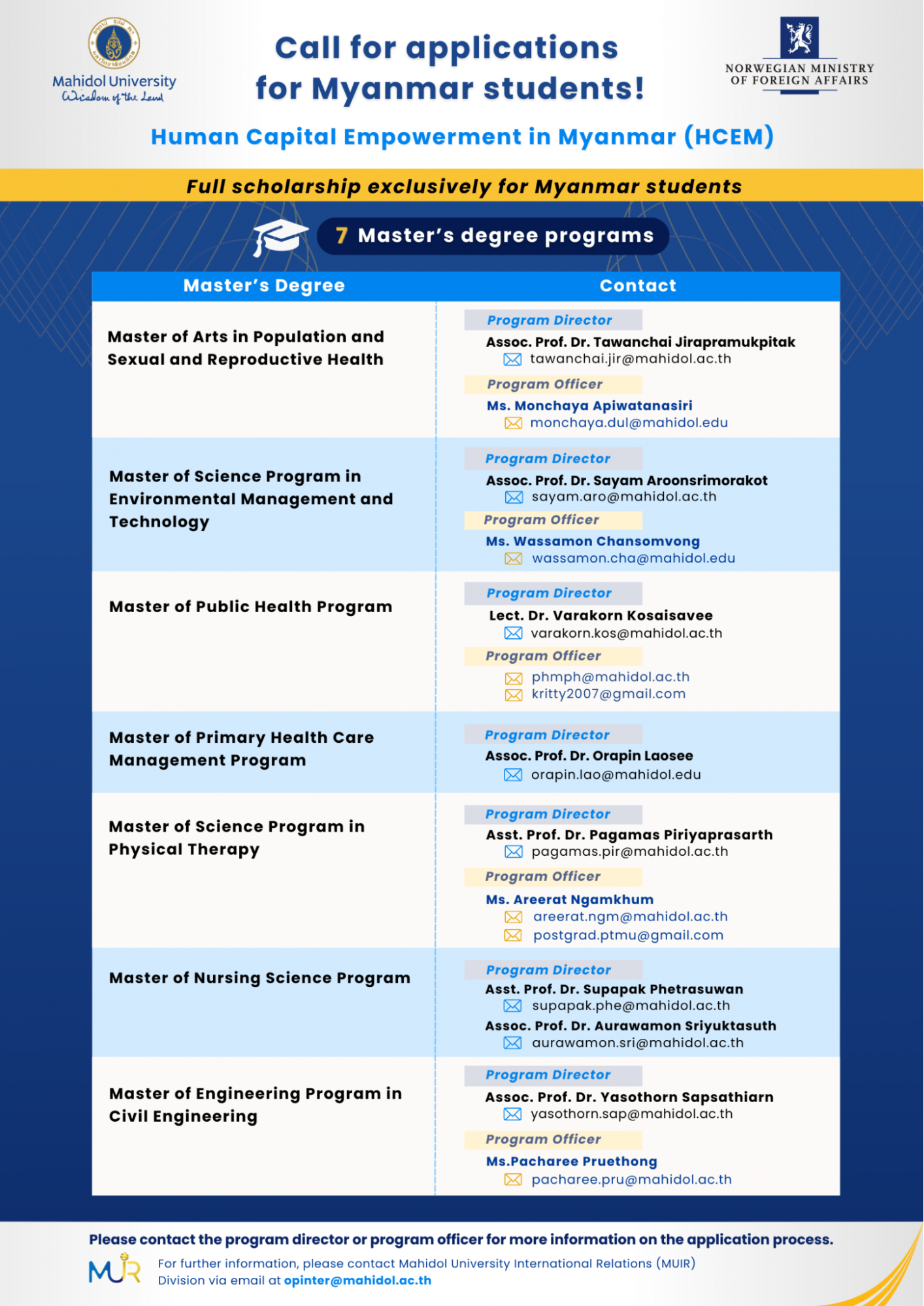 The ‘Human Capital Empowerment in Myanmar (HCEM)’ is a follow up project of the previous three Mahidol-Norway Capacity Building Initiative for Myanmar and ASEAN (CBIM Phase 1/2 and CBIA) undertaken during 2013-2022. The previous 3 projects aimed at promoting sustainable development through knowledge and skill upgrades to Myanmar and ASEAN human capital. Mahidol University was trusted and tasked by the Norwegian government by enrolling around 200 students to various Master’s and Doctoral programmes provided in Mahidol University throughout the past years under the 3 scholarship projects.