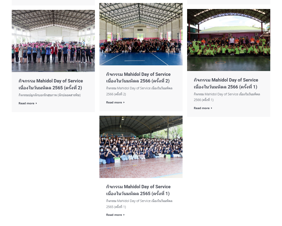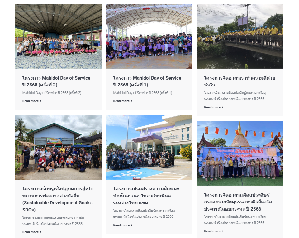 The Mahidol Volunteer initiative was established to gather information on volunteer opportunities from both internal and external organizations. It provides a platform for students to engage in diverse volunteer activities that align with their abilities and interests. Moreover, it fosters collaboration between Mahidol University and volunteer networks, cultivating a sense of social responsibility among students.