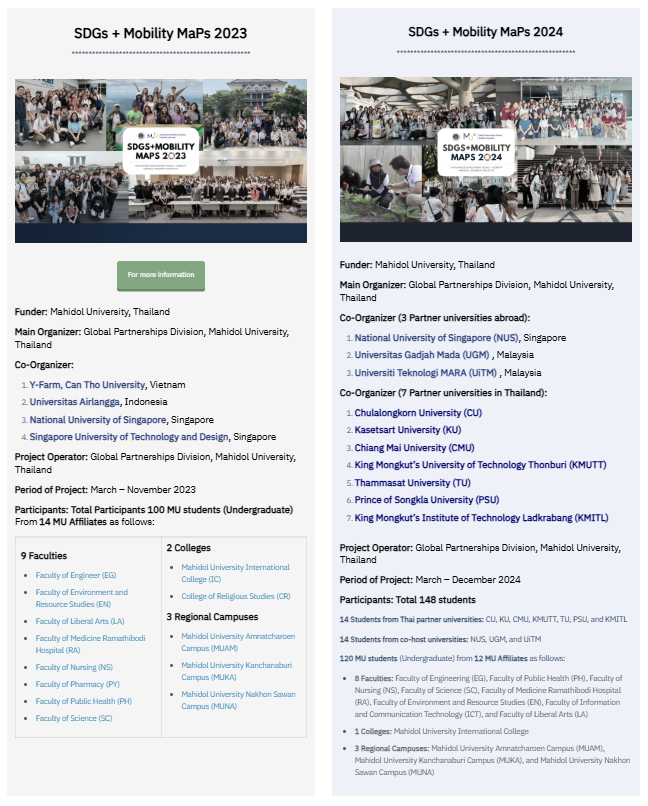 In addition to its academic initiatives, Mahidol University has launched the Sustainable Development Goals + Mobility Mahidol University Projects (SDGs + Mobility MaPs 2023–2025) . This program brings together over 120 Mahidol University undergraduates, 14 students from Thai partner universities, and 14 students from co-host institutions— Universitas Gadjah Mada (UGM), National University of Singapore (NUS), and Universiti Teknologi MARA (UiTM) . Through this initiative, student teams develop hands-on projects addressing SDG-related challenges, aiming to raise sustainability awareness, foster entrepreneurship, and promote international collaboration. The program helps participants understand sustainable development practices within ASEAN countries while strengthening their problem-solving, teamwork, and cross-cultural communication skills. Interdisciplinary groups propose SDG-focused projects, with 25 selected for incubation and mentorship by expert advisors. These teams then join mobility programs across ASEAN nations and showcase their work at the SDGs + Mobility MaPs Forum , where they share project outcomes, insights, and experiences—further advancing Mahidol University’s dedication to sustainability and global partnership.