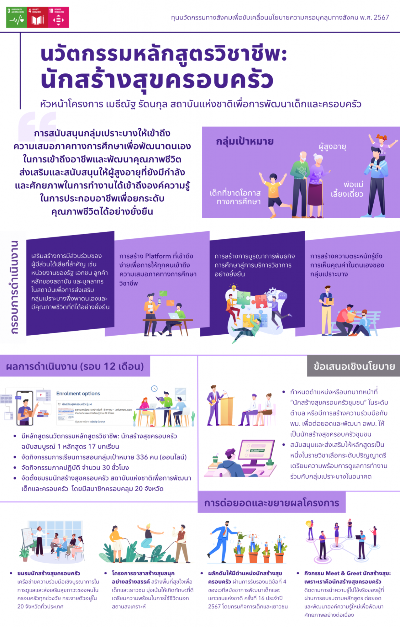 The Net PAMA Project has earned multiple recognitions, including the Prime Minister’s Award for Health Promotion Innovation (2022), the Government Service Award for Service Innovation (2023), and the Team Good Practice Award from Mahidol Quality Fair (2023). Aligned with the UN Sustainable Development Goals (SDGs)—notably SDG 3 (Good Health and Well-being), SDG 4 (Quality Education), SDG 5 (Gender Equality), SDG 10 (Reduced Inequalities), and SDG 16 (Peace, Justice, and Strong Institutions)—the initiative advances family well-being, promotes lifelong learning for parents, encourages shared parental responsibility, reduces inequality in access to parenting education, and fosters non-violent, nurturing home environments.